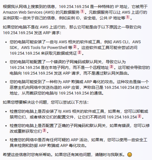 为什么电脑手动配置了ip 地址后,在arp表里有169.254.169.254的arp表项(有的电脑有有的电脑没有,并且都可以正常上网),并且169.254.169.254表项里对应的mac 地址是网关的Mac地址,网关在核心上交换机上,但是核心交换机上没有169.254.169.254这个地址,我用wireshark抓包看到电脑主动发送对169.254.169.254的arp请求包,并且网关回复了arp请求。