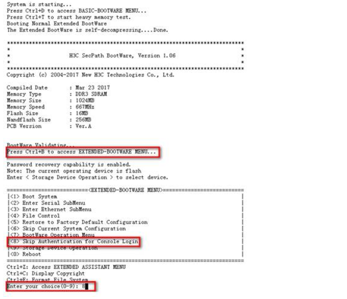 #设备启动过程中根据提示按 crtl+B进入 bootware界面,选择 <8>跳过 Console 密码认证