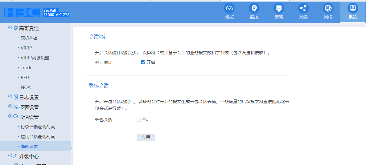 系系统---会话设置---高级设置开启会话统计已经是开启的,但在监控-统计-流量统计里面都看不到任何数据。只能在概览里面看到总会话数,我是要能看到每个IP实时外网的上下行带宽数据。