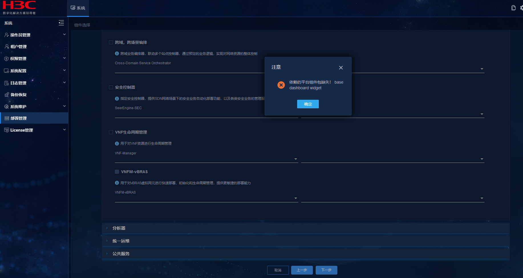 在底座中安装SeerEngine-DC时,只上传 SeerEngine_DC-E6108-MATRIX.zip安装包,组件选择时只选择DC控制器,安装报错
