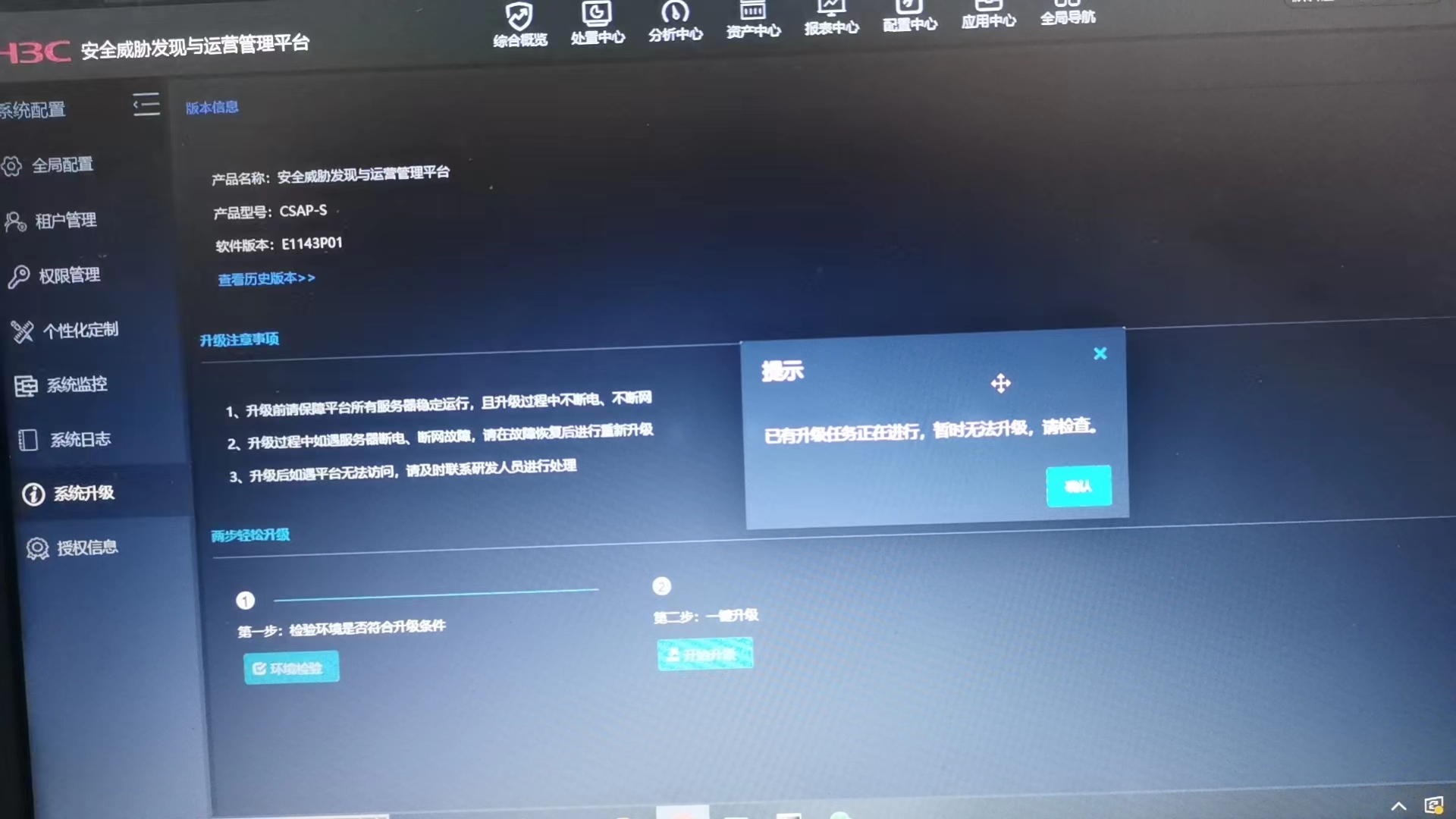 请问态势感知E1143P01升级到E1143P04版本导入升级文件的时候由于网络断开了,导致需要重新导入升级文件,可是导入的时候出现升级任务正在进行,暂时无法升级,请检查。这种情况要如何解决?