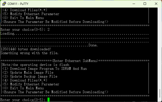 ==========================<Enter Ethernet SubMenu>========================== |Note:the operating device is flash | |<1> Download Image Program To SDRAM And Run | |<2> Update Main Image File | |<3> Update Backup Image File | |<4> Download Files(*.*) | |<5> Modify Ethernet Parameter | |<0> Exit To Main Menu | |<Ensure The Parameter Be Modified Before Downloading!> | ============================================================================ Enter your choice(0-5): 2 Loading..................................................................... ............................................................................ ............................................................................ .............................................Done. 13501440 bytes downloaded! Something wrong with the file.