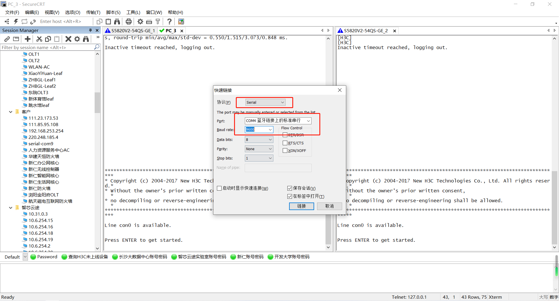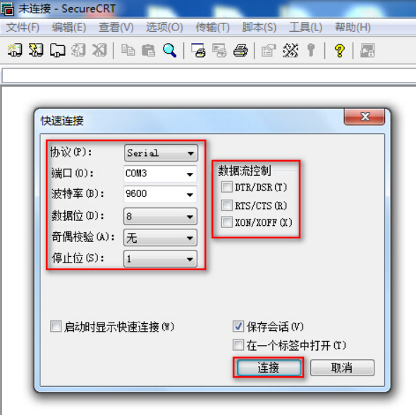 双击运行SecureCRT软件,找到【文件】菜单下【快速连接】选项,如下图,协议选Serial,端口选com3,波特率为9600,数据位为8,奇偶校验无,停止位为1,最后点击【连接】。