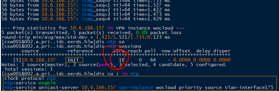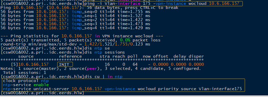 ntp-service unicast-server 10.6.166.157 vpn-instance wocloud priority source Vlan-interface175