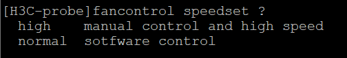 • 在probe视图下,执行fancontrol speedset mode命令,设置风扇的转速模式,其中mode可以是normal、high或auto。