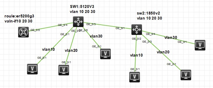 如上图所示,无管理Switch A连接ER路由器的LAN1接口,有管理Switch B连接LAN2接口,实现Switch A下所有客户端获取到VLAN2的地址,Switch B下存在两个VLANVLAN3192.168.3.0/24VLAN4192.168.4.0/24)对应两个部门,部门之间禁止互访。