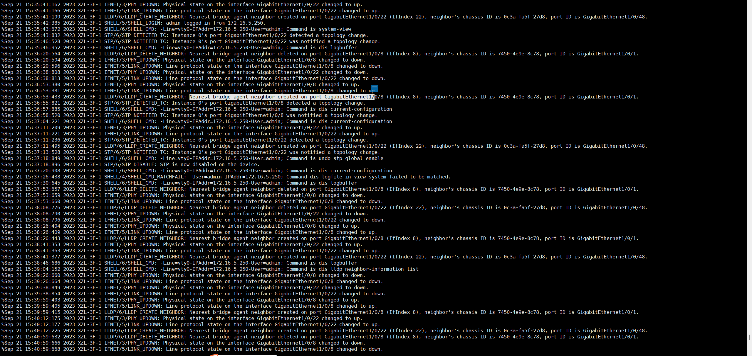%Sep 21 15:45:38:664 2023 XZL-3F-1 IFNET/3/PHY_UPDOWN: Physical state on the interface GigabitEthernet1/0/8 changed to down. %Sep 21 15:45:38:668 2023 XZL-3F-1 IFNET/5/LINK_UPDOWN: Line protocol state on the interface GigabitEthernet1/0/8 changed to down. %Sep 21 15:45:38:775 2023 XZL-3F-1 LLDP/6/LLDP_DELETE_NEIGHBOR: Nearest bridge agent neighbor deleted on port GigabitEthernet1/0/22 (IfIndex 22), neighbor's chassis ID is 0c3a-fa5f-27d8, port ID is GigabitEthernet1/0/48. %Sep 21 15:45:38:792 2023 XZL-3F-1 IFNET/3/PHY_UPDOWN: Physical state on the interface GigabitEthernet1/0/22 changed to down. %Sep 21 15:45:38:793 2023 XZL-3F-1 IFNET/5/LINK_UPDOWN: Line protocol state on the interface GigabitEthernet1/0/22 changed to down.
