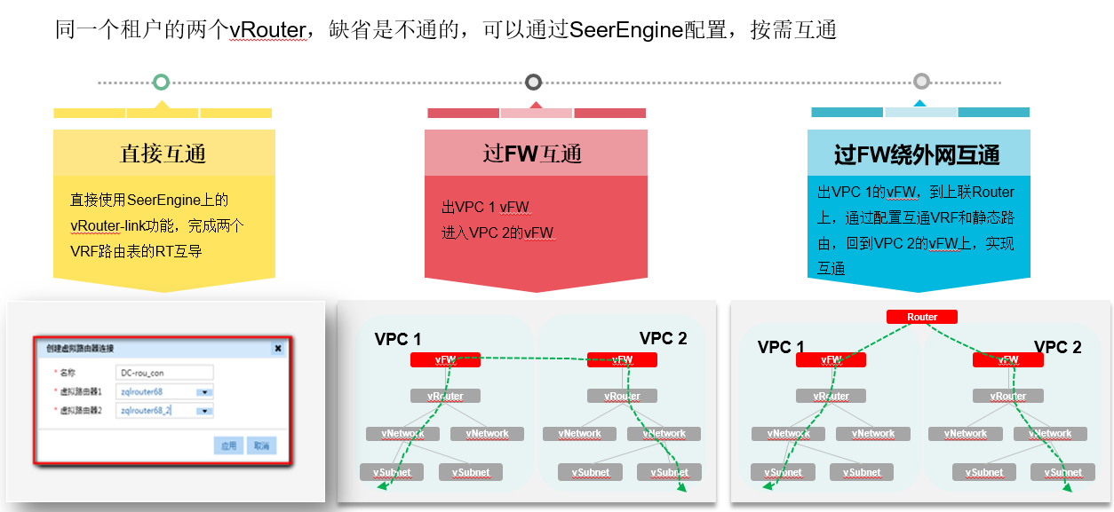 我司ADDC解决方案中分布式虚拟路由器连接功能实现原理是什么?将两个虚拟路由器连接起来,会在相应的交换机下发哪些配置,有没有详细的指导手册,找了一圈没找到资料