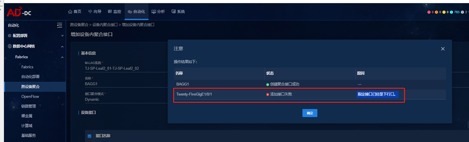ADDC上手动配置聚合口时,提示指定接口已经是下行口。
