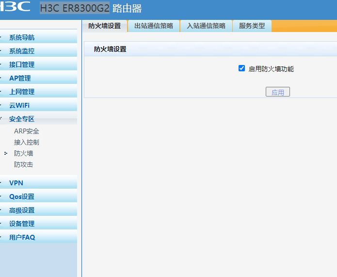 ER8300G2->安全专区->防火墙->出站通信策略设置 , 增加一项,禁止访问一个固定IP地址 ,如图,设置后启用策略,结果就什么网站也不能上了