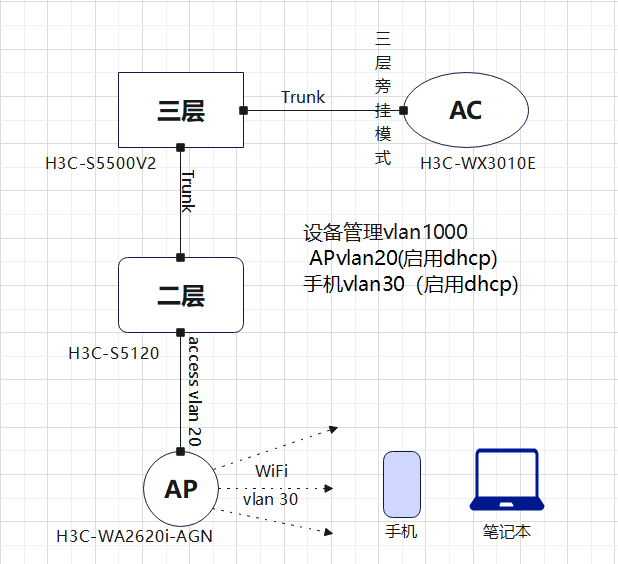三层、二层、AC、AP设备网络已经配通了,AP分配的vlan是20(已获取地址),手机和笔记本分配的vlan是30(没有信号连接,未获取到IP地址);