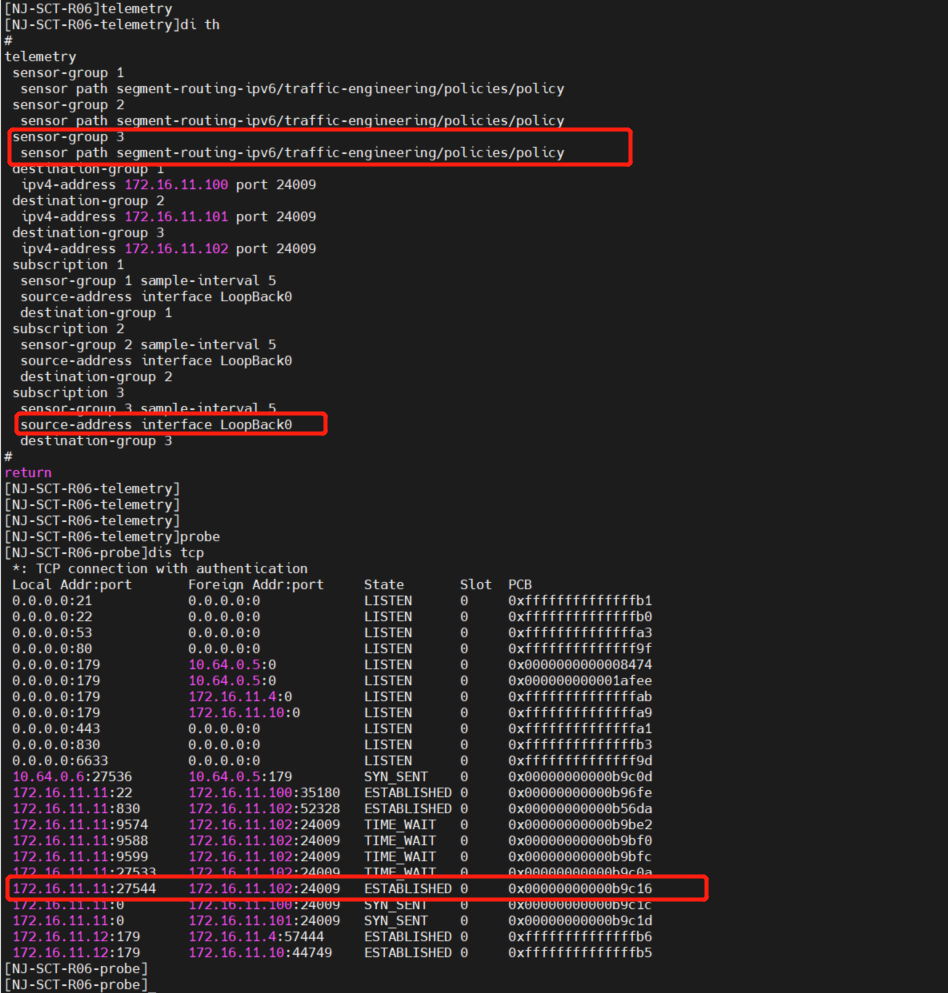 H3C MSR3640 配置telemetry时,通过配置 source-address interface LoopBack0 方式,这种方式是可以进行消息上报的,但需要注意以下几点1:
