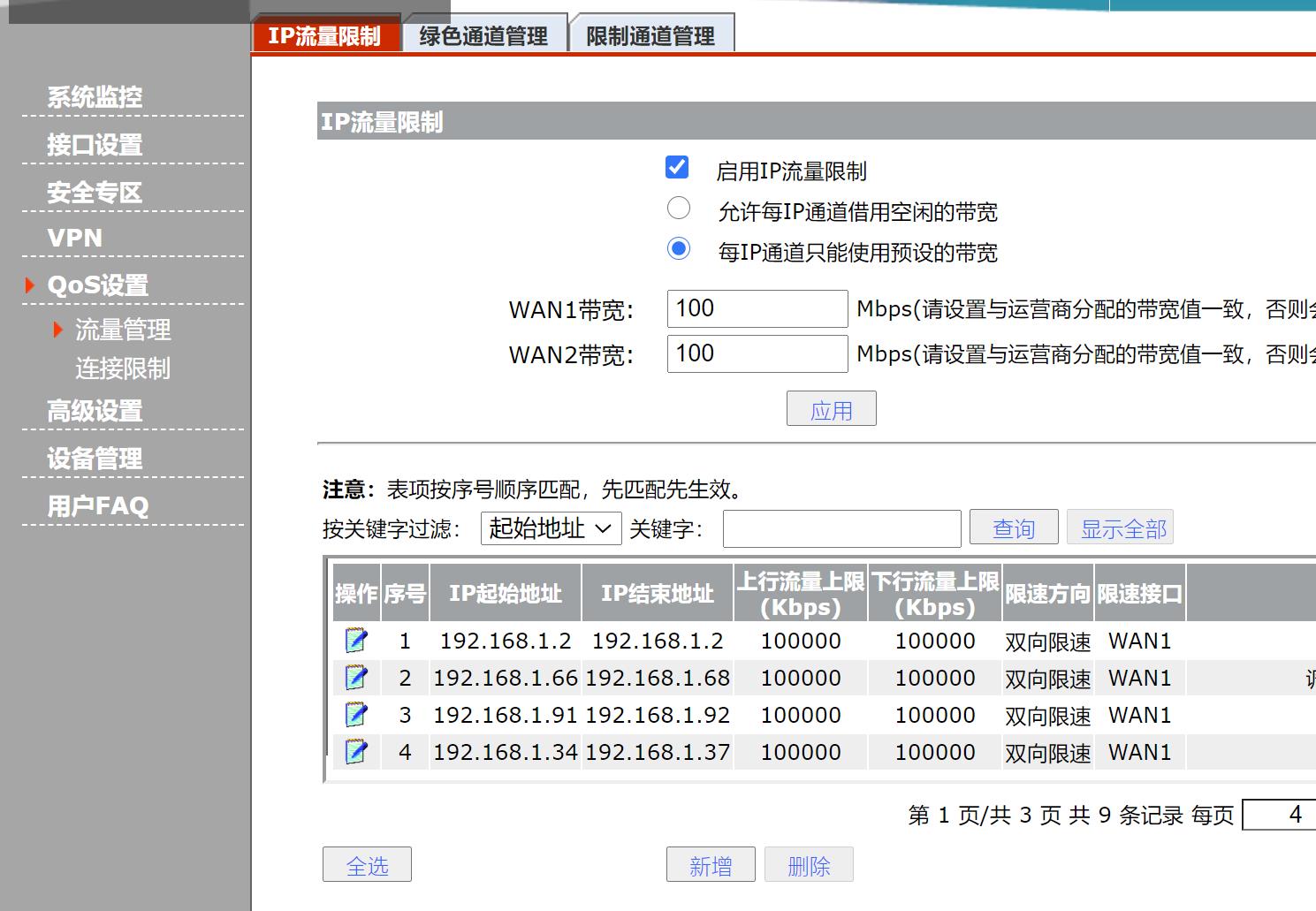 我们WAN1口接的外网。WAN2口没接线。总之目前这样设置,下面每个区间段网速都是不会超过100M,但是我们是1000M的外网,现在需要给下面几个IP段设置不同的限速,有的100M,有的200M,请问怎么设置