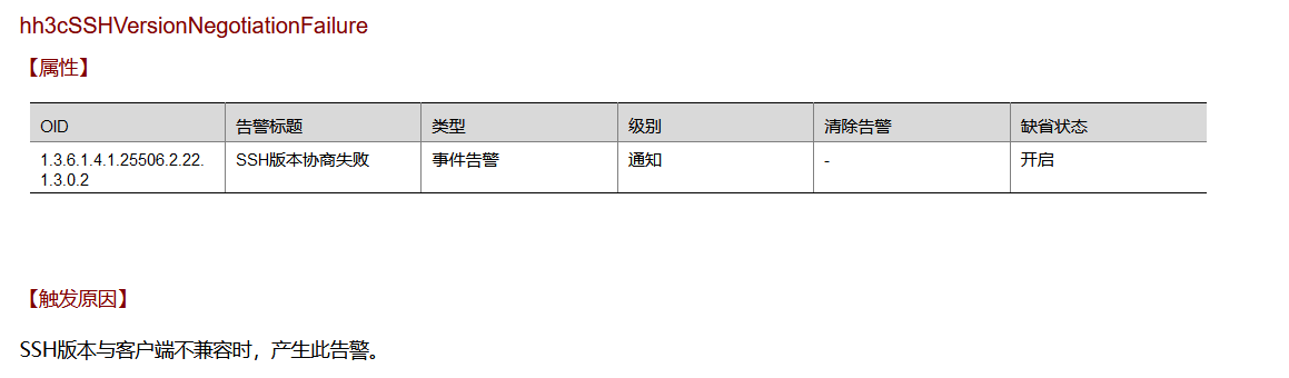 SSH/4/TrapVerNegoFailed(t): 1.3.6.1.4.1.25506.2.22.1.3.0.2<hh3cSSHVersionNegotiationFailure> SSH version negotiation fail trap information
