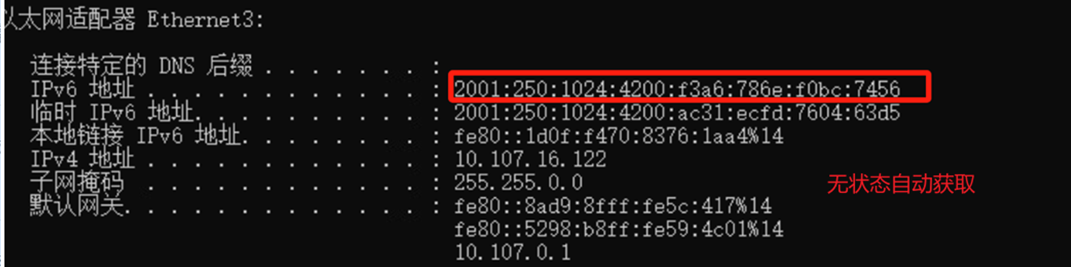 您在虚接口配置了DHCPv6请求,但是没有配置ipv6 nd autoconfig managed-address-flag 和ipv6 nd autoconfig other-flag 这两条命令,终端获取到的地址也是无状态自动获取,这是因为您的DHCPv6服务器没有为终端分配地址前缀,而是只分配了其他配置信息,如DNS服务器地址等。这种情况下,终端会使用无状态地址自动配置(SLAAC)来生成自己的IPv6地址,而不是使用DHCPv6服务器分配的地址。SLAAC是一种基于ND协议的机制,终端通过接收RA报文中携带的地址前缀来生成自己的IPv6地址4。