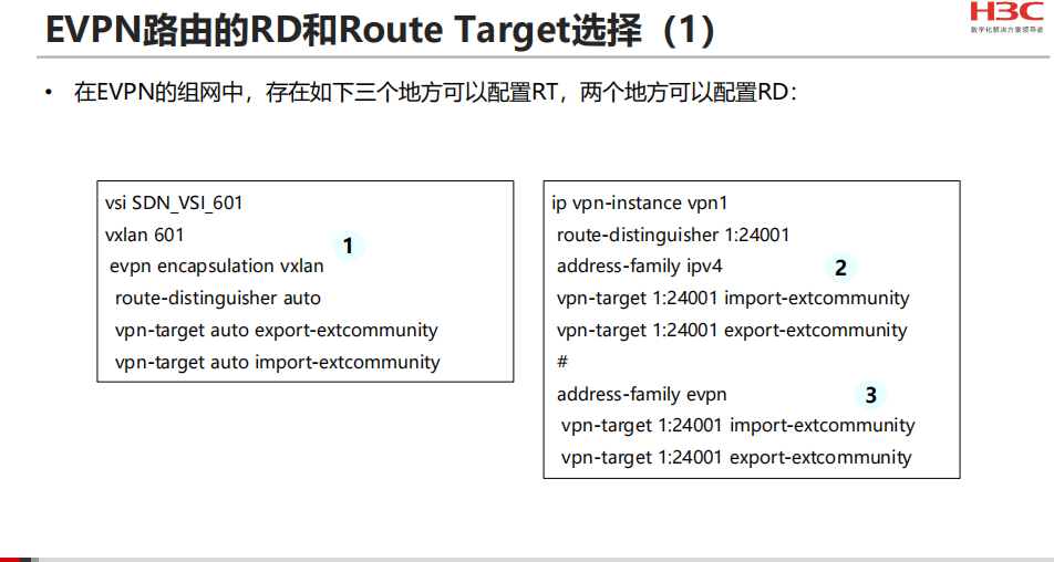 EVPN(Ethernet Virtual Private Network)是一种用于二层网络互联的VPN技术,在VXLAN网络中引入EVPN作为VXLAN的控制平面。对于每一个EVPN,都具有路由区分符(Route Distinguisher:RD)和路由目标(Route Target:RT)两大属性,这些属性用于控制在VTEP之间发送或接收EVPN路由。