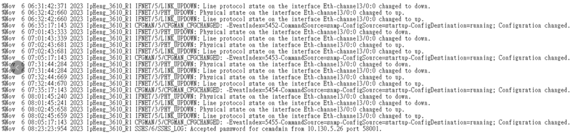 有插卡 <IpHeng_3610_R2>screen-len disable <IpHeng_3610_R2> <IpHeng_3610_R2>dis version H3C Comware Software, Version 7.1.064, Release 0821P18 Copyright (c) 2004-2021 New H3C Technologies Co., Ltd. All rights reserved. H3C MSR3610 uptime is 0 weeks, 0 days, 0 hours, 15 minutes Last reboot reason : User reboot Boot image: flash:/msr36x1-cmw710-boot-r0821p18.bin Boot image version: 7.1.064P80, Release 0821P18 Compiled Dec 06 2021 15:00:00 System image: flash:/msr36x1-cmw710-system-r0821p18.bin System image version: 7.1.064, Release 0821P18 Compiled Dec 06 2021 15:00:00 Feature image(s) list: flash:/msr36x1-cmw710-escan-r0821p18.bin, version: 7.1.064 Compiled Dec 06 2021 15:00:00 flash:/msr36x1-cmw710-security-r0821p18.bin, version: 7.1.064 Compiled Dec 06 2021 15:00:00 flash:/msr36x1-cmw710-voice-r0821p18.bin, version: 7.1.064 Compiled Dec 06 2021 15:00:00 flash:/msr36x1-cmw710-data-r0821p18.bin, version: 7.1.064 Compiled Dec 06 2021 15:00:00 CPU ID: 0x11 2G bytes DDR3 SDRAM Memory 8M bytes Flash Memory PCB Version: 2.0 CPLD Version: 1.0 Basic BootWare Version: 1.32 Extended BootWare Version: 1.32 [SLOT 0]CON (Hardware)2.0, (Driver)1.0, (CPLD)1.0 [SLOT 0]GE0/0 (Hardware)2.0, (Driver)1.0, (CPLD)1.0 [SLOT 0]GE0/1 (Hardware)2.0, (Driver)1.0, (CPLD)1.0 [SLOT 0]GE0/2 (Hardware)2.0, (Driver)1.0, (CPLD)1.0 [SLOT 0]GE0/3 (Hardware)2.0, (Driver)1.0, (CPLD)1.0 [SLOT 0]SFP0/4 (Hardware)2.0, (Driver)1.0, (CPLD)1.0 [SLOT 0]SFP0/5 (Hardware)2.0, (Driver)1.0, (CPLD)1.0 [SLOT 0]CELLULAR0/0 (Hardware)2.0, (Driver)1.0, (CPLD)1.0 [SLOT 3]SIC-4G-CNDE (Hardware)2.0, (Driver)1.0, (CPLD)1.0 [SLOT 4]SIC-4GSWF (Hardware)2.0, (Driver)1.0, (CPLD)1.0 <IpHeng_3610_R2> <IpHeng_3610_R2>dis dev man Slot 0: DEVICE_NAME : MSR3610 DEVICE_SERIAL_NUMBER : 210235A1X5P22600004H MAC_ADDRESS : A8C9-8A3D-9FAD MANUFACTURING_DATE : 2022-06-09 VENDOR_NAME : H3C PRODUCT ID : RT-MSR3610-X1-DP Slot 3: DEVICE_NAME : RT-SIC-4G-CNDE DEVICE_SERIAL_NUMBER : 210231A6C5P2230001CJ MAC_ADDRESS : NONE MANUFACTURING_DATE : 2022-03-30 VENDOR_NAME : H3C PRODUCT ID : RT-SIC-4G-CNDE Slot 4: DEVICE_NAME : RT-SIC-4GSWF DEVICE_SERIAL_NUMBER : 210231A3FGP22800002Q MAC_ADDRESS : 9820448379D0 MANUFACTURING_DATE : 2022-08-19 VENDOR_NAME : H3C PRODUCT ID : RT-SIC-4GSWF <IpHeng_3610_R2> <IpHeng_3610_R2>dis cu # version 7.1.064, Release 0821P18 # sysname IpHeng_3610_R2 # clock timezone HK add 08:00:00 clock protocol ntp # ip vpn-instance EV # wlan global-configuration # security-zone intra-zone default permit # bfd echo-source-ip 100.100.100.100 # track 1 interface GigabitEthernet0/5.1 # track 2 nqa entry admin network_monitor reaction 1 # track 3 nqa entry admin network_monitor reaction 2 # dialer-group 1 rule ip permit # ip unreachables enable ip ttl-expires enable # dhcp enable dhcp server always-broadcast # dns proxy enable # lldp global enable # system-working-mode standard password-recovery enable # vlan 1 # vlan 10 description EV_LAN # vlan 20 description EV_MGMT # stp region-configuration region-name ipheng active region-configuration # stp instance 0 root secondary stp global enable # dhcp server ip-pool ev_2 vpn-instance EV gateway-list 192.168.0.1 network 192.168.0.0 mask 255.255.255.0 address range 192.168.0.100 192.168.0.199 dns-list 202.175.3.9 8.8.8.8 # nqa entry admin network_monitor type icmp-echo destination ip 10.126.100.1 frequency 3000 history-record enable probe count 3 probe timeout 1000 reaction 1 checked-element probe-fail threshold-type consecutive 10 action-type trigger-only reaction 2 checked-element probe-fail threshold-type consecutive 10 action-type trap-only source ip 192.168.0.3 vpn-instance EV # nqa schedule admin network_monitor start-time now lifetime forever # apn-profile ctm apn static ctm-mobile # controller Cellular0/0 # controller Cellular3/0 eth-channel 0 # controller Cellular3/1 # interface NULL0 # interface Vlan-interface10 description EV_NAT ip binding vpn-instance EV ip address 192.168.0.3 255.255.255.0 vrrp vrid 10 virtual-ip 192.168.0.1 vrrp vrid 10 preempt-mode delay 2000 # interface Vlan-interface20 description EV_MGT ip address 10.143.160.99 255.255.255.248 vrrp vrid 20 virtual-ip 10.143.160.97 vrrp vrid 20 preempt-mode delay 2000 # interface GigabitEthernet0/0 port link-mode route # interface GigabitEthernet0/1 port link-mode route # interface GigabitEthernet0/2 port link-mode route combo enable copper # interface GigabitEthernet0/3 port link-mode route combo enable copper # interface GigabitEthernet0/4 port link-mode route # interface GigabitEthernet0/5 port link-mode route # interface GigabitEthernet0/5.1 description EV_NAT ip binding vpn-instance EV ip address 10.143.168.101 255.255.255.224 nat outbound 3000 vpn-instance EV vlan-type dot1q vid 1306 # interface GigabitEthernet0/5.2 description EV_MGT ip address 10.143.164.101 255.255.255.224 vlan-type dot1q vid 1304 # interface GigabitEthernet4/0 port link-mode bridge port link-type trunk port trunk permit vlan all # interface GigabitEthernet4/1 port link-mode bridge port link-type trunk port trunk permit vlan all # interface GigabitEthernet4/2 port link-mode bridge port link-type trunk port trunk permit vlan all # interface GigabitEthernet4/3 port link-mode bridge port link-type trunk port trunk permit vlan all # interface Eth-channel3/0:0 ip binding vpn-instance EV dialer circular enable dialer-group 1 dialer timer idle 0 dialer timer wait-carrier 5 dialer timer autodial 60 dialer number *99# autodial ip address cellular-alloc tcp mss 1460 nat outbound 3000 vpn-instance EV # scheduler logfile size 16 # line class console user-role network-admin # line class tty user-role network-operator # line class usb user-role network-admin # line class vty user-role network-operator # line con 0 authentication-mode scheme user-role network-admin # line vty 0 63 authentication-mode scheme user-role network-operator # ip route-static 10.0.0.0 8 10.143.164.97 description IMC ip route-static vpn-instance EV 0.0.0.0 0 Eth-channel3/0:0 preference 75 description 4G ip rout