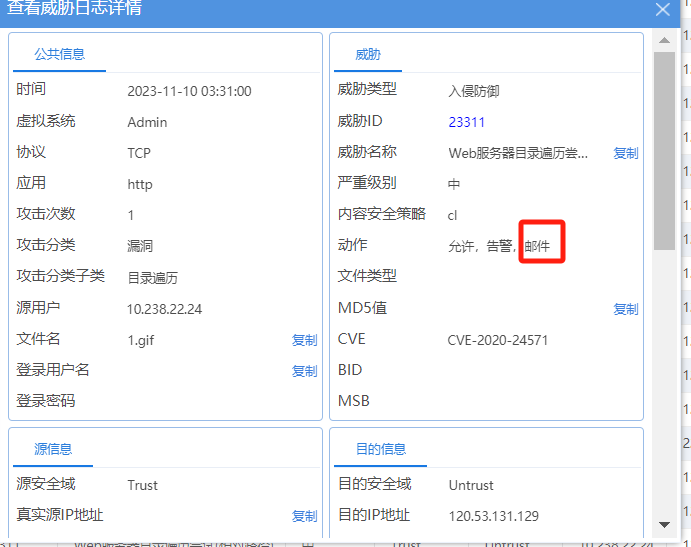 您好,我查看这个威胁ID,动作有“邮件” 可是收不到威胁邮件