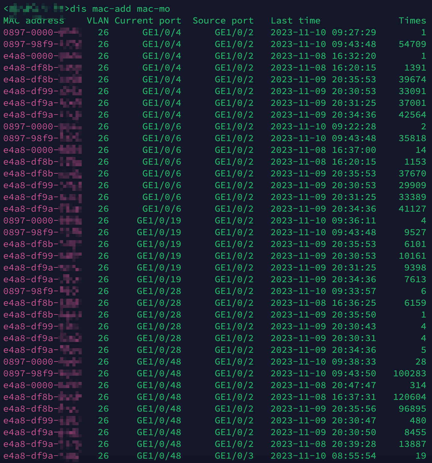 dis mac-add mac-mo发现有短时间大量mac地址漂移日志,48口为上联汇聚口