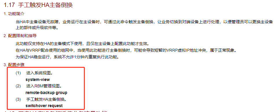 当HA中主备设备无故障,业务运行在主设备时,可通过此命令触发主备倒换,以便管理员可以更换主设备上的部件或升级软件等。