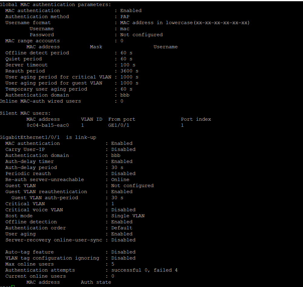 2013-01-01 05:05:54 NotificationLine protocol state on the interface GigabitEthernet1/0/1 changed to up. 2013-01-01 05:05:54 ErrorPhysical state on the interface GigabitEthernet1/0/1 changed to up. 2013-01-01 05:05:49 NotificationLine protocol state on the interface GigabitEthernet1/0/1 changed to down. 2013-01-01 05:05:49 ErrorPhysical state on the interface GigabitEthernet1/0/1 changed to down. 2013-01-01 05:05:28 Informational-Line=aux0-IPAddr=**-User=**; Command is display mac-authentication 试了几次都是这样,只有display mac-auth里面的 authentication attempts failed 每次+1