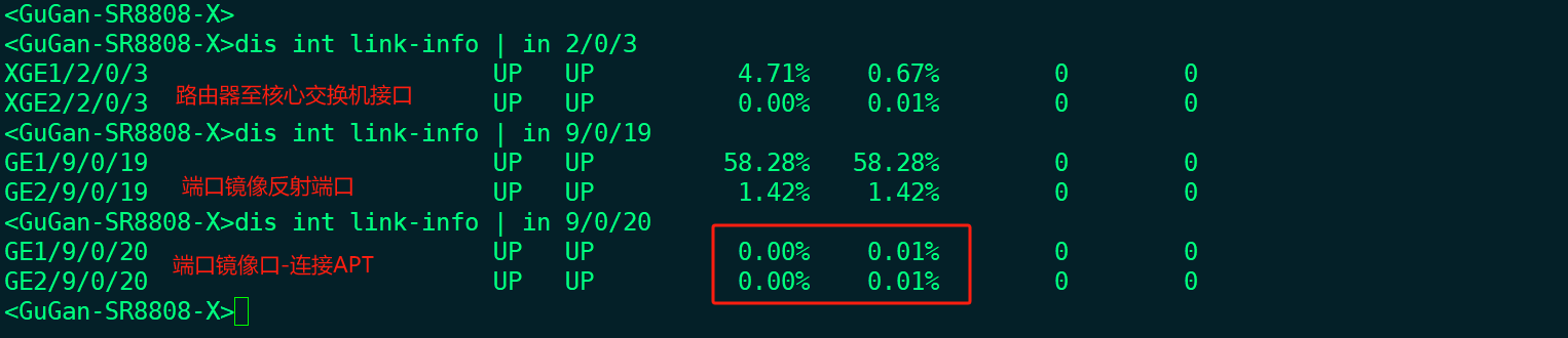 上下行流量镜像给第三方态势感知设备。第三方态势感知测发现采集的口无可用流量。反馈至h3c侧排查。经排查发现,上下行接口流量如下图:给apt态势感知镜像的流量接口只有0.01%。