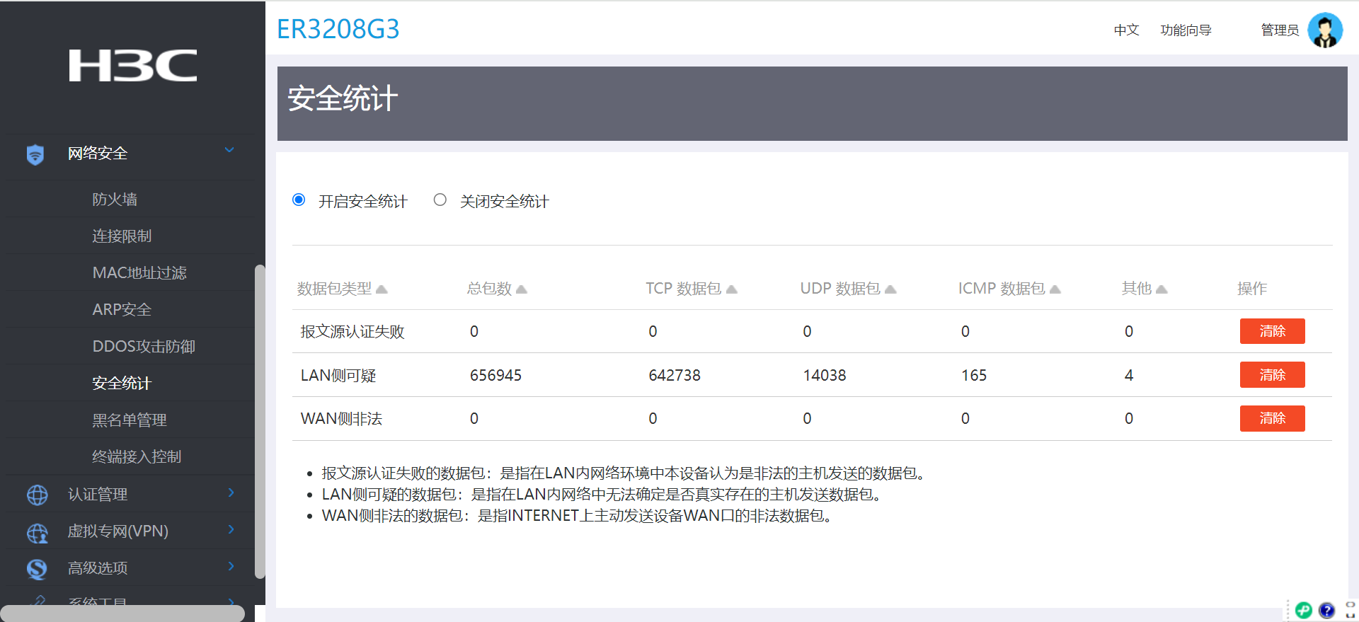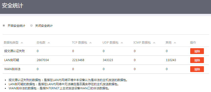 网络安全 -》安全统计 -》开启安全统计 之后LAN侧可疑数据非常多,清除后后增长很快