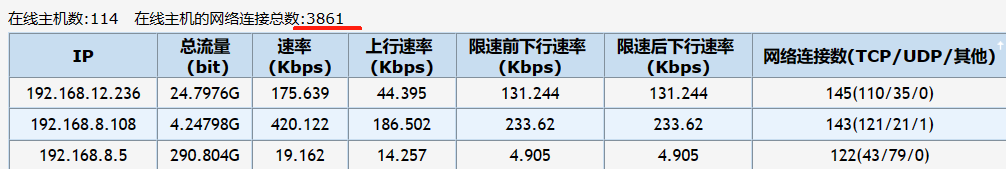 例如运营商带宽为10Mbps,带机量100台PC,80%的带宽就是8Mbps,20%的人就是20个人,那么8Mbps*1000=8000kbps(实际上应该乘以1024,这里简单以1000计算),8000kbps/20=400kbps,则理论值为每IP需要下行限速400kbps,上行值为200~300kbps,当然该计算值是理论值,需要根据实际的网络使用量来适当变化。如果是ADSL宽带类型客户,则上行带宽建议限制为100kbps,且不推荐“共享式”流量分配方式。如果企业、酒店等环境,平时使用网络的时间或者占用的流量不是很大,那么可以适当将限速值调高,如下行600kbps,上行400kbps,并开启“共享式”流量分配方式。如网吧环境,带宽使用量较大,则需要增加带宽或者较少带机量来提高客户网速的体验,保证游戏和视频的正常工作。网吧一般建议每IP限速下行800kbps,上行500kbps,开启弹性带宽功能,即允许每IP通道借用空闲的带宽。双WAN设备需要针对不同的WAN口计算不同的限速值予以限制,最终主机获得的带宽为双WAN带宽限速总和。