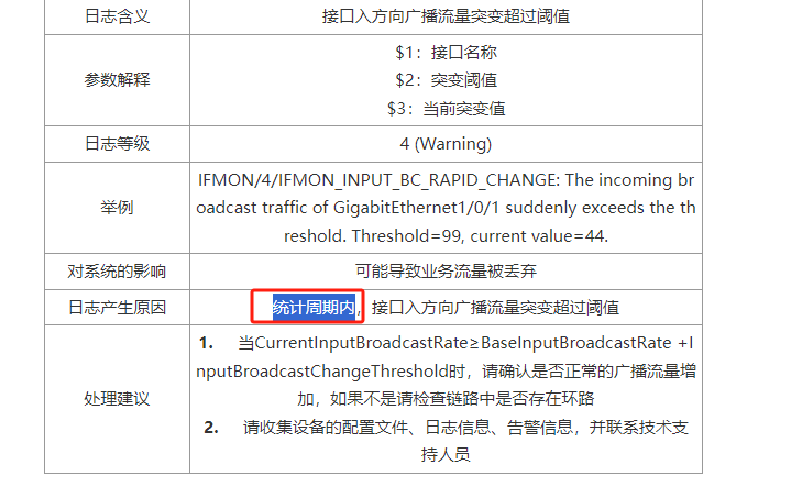 日志含义 | 接口入方向广播流量突变超过阈值 |