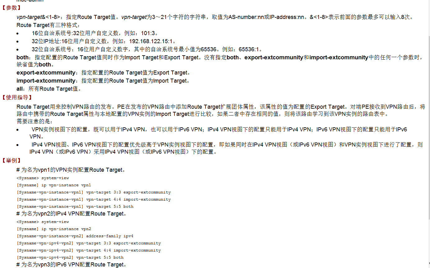 Route Target用来控制VPN路由的发布。PE在发布的VPN路由中添加Route Target扩展团体属性,该属性的值为配置的Export Target。对端PE接收到VPN路由后,将路由中携带的Route Target属性与本地配置的VPN实例的Import Target进行比较,如果二者中存在相同的值,则将该路由学习到该VPN实例的路由表中。