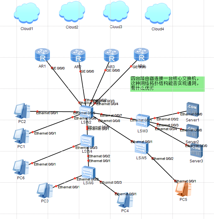 公司拉了两条电信专线,两条移动专线分别接入了四台H3C ER5200G2路由器,四台路由器都接入到一台核心交换机S5500V3-54S-DP-SI 上,S5500V3-54S-DP-SI两台做有堆叠,核心交换机到服务器使用的是S5500V3-28T8XC-HI交换机两台,也做有堆叠,这种网络拓扑结构是否可行