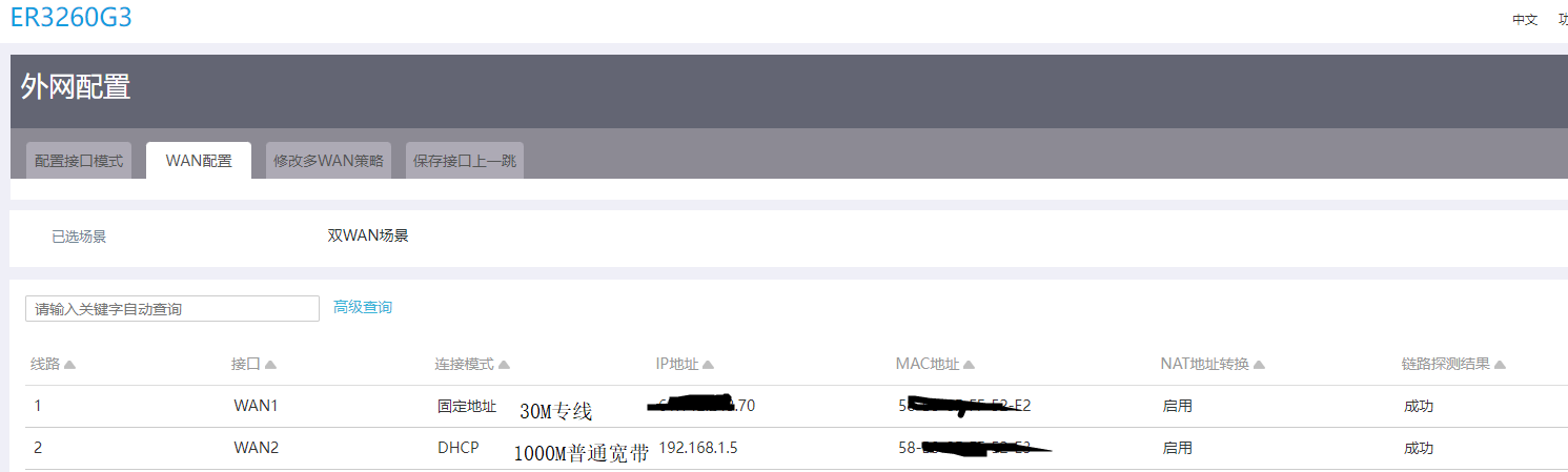 H3C ER3260G3路由器 接了一条 30M固定公网IP专线,一条1000M动态IP普通宽带。