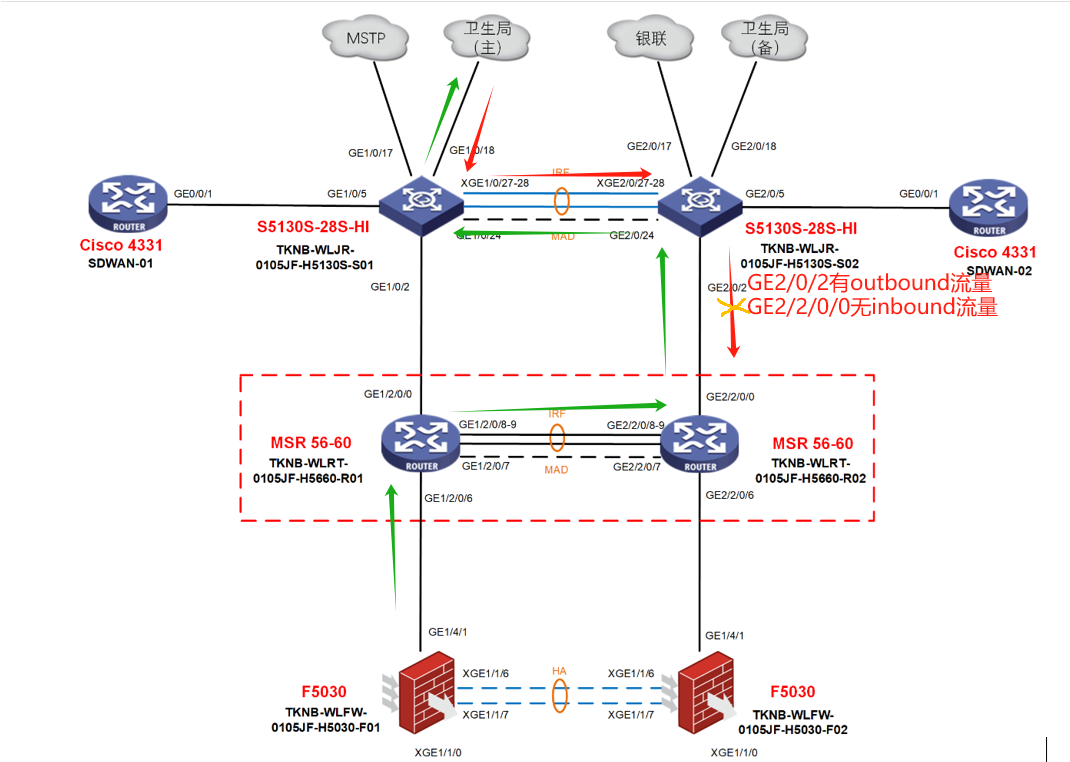 如下拓扑图 ,两台MSR5660做IRF,左边设备为主设备,断开GE1/2/0/0口后,访问客户端不通,通过做流量统计发现GE2/2/0/0在inbound方向没有任何流量,这是为什么呢?