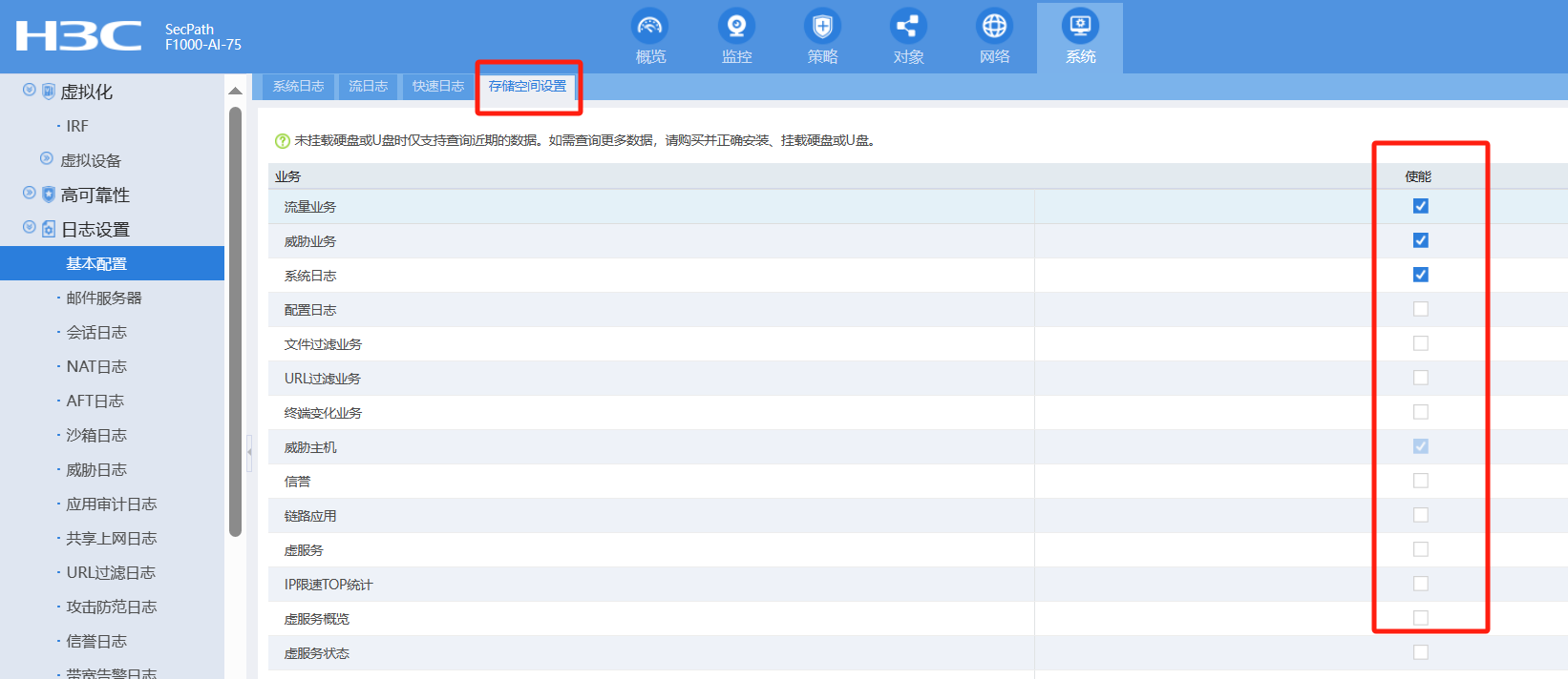 系统-日志设置-基本配置-存储空间设置 看下里面系统日志√了没
