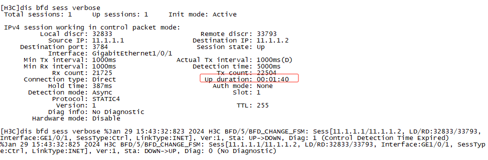 %Jan 29 10:00:42:597 2024 H3C BFD/5/BFD_CHANGE_FSM: Sess[11.1.1.1/11.1.1.2, LD/RD:32833/33793, Interface:GE1/0/1, SessType:Ctrl, LinkType:INET], Ver:1, Sta: UP->DOWN, Diag: 1 (Control Detection Time Expired)