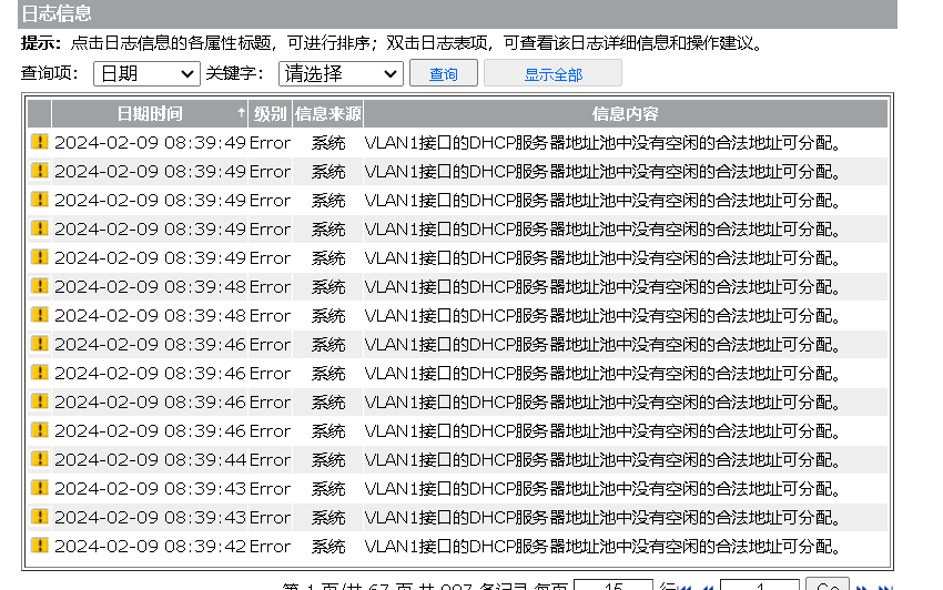 ER3100路由器运行日志提示VLAN1接口的DHCP服务器地址池中没有空闲的合法地址可分配