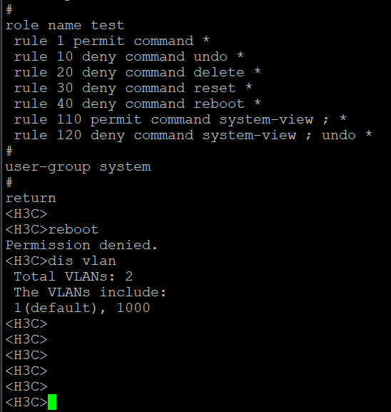 Role: level-13 Description: Predefined level-13 role VLAN policy: permit (default) Interface policy: permit (default) VPN instance policy: permit (default) ------------------------------------------------------------------- Rule Perm Type Scope Entity ------------------------------------------------------------------- 1 permit command * 5 deny command undo 10 deny command no 15 deny command role R:Read W:Write X:Execute 大佬 改成这样也不行