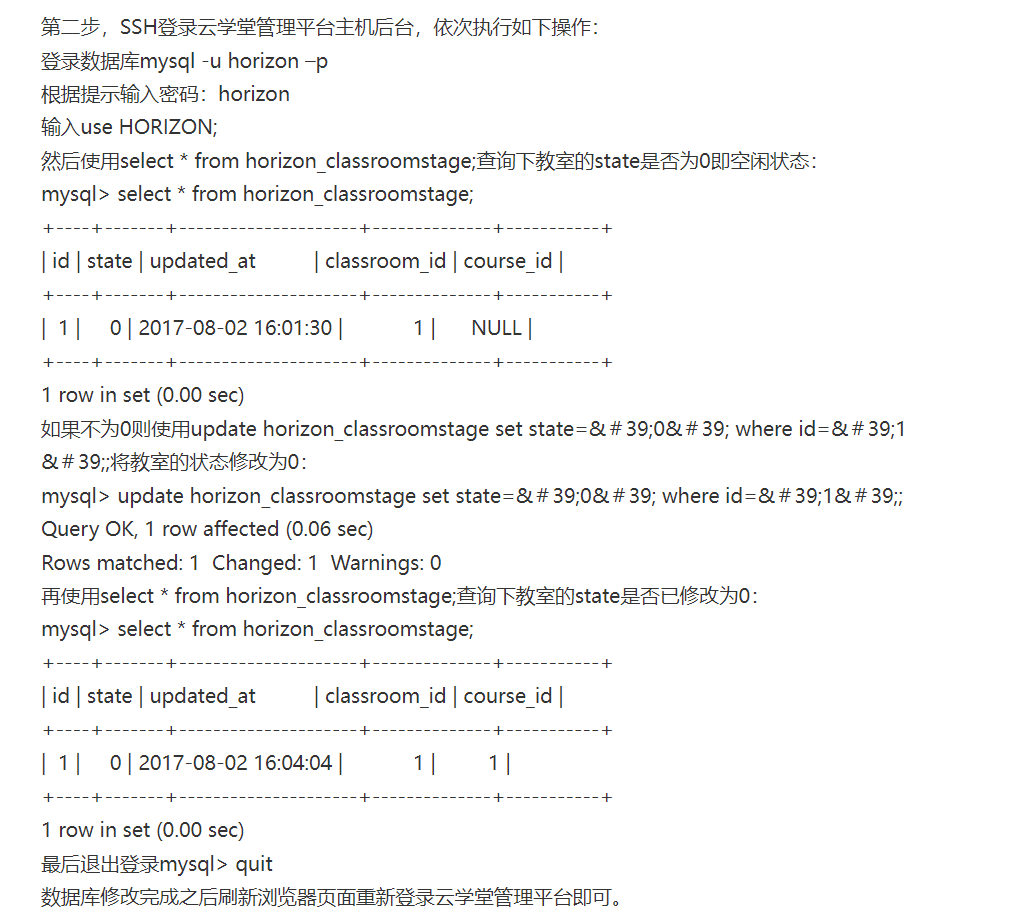 5. 如果上一步中教室的state数值不为0,则执行“update horizon_classroomstage set state='0' where id='1';”命令将教室的状态值修改为0。