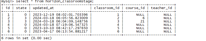 6. 修改完成后再执行select * from horizon_classroomstage命令查询确认教室的state数值是否已修改为0。