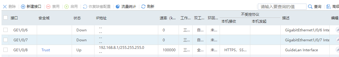 看图里是三层口,直接把该接口放进任意安全域里,然后在安全策略那里配个全通就行(两边防火墙都需要配)