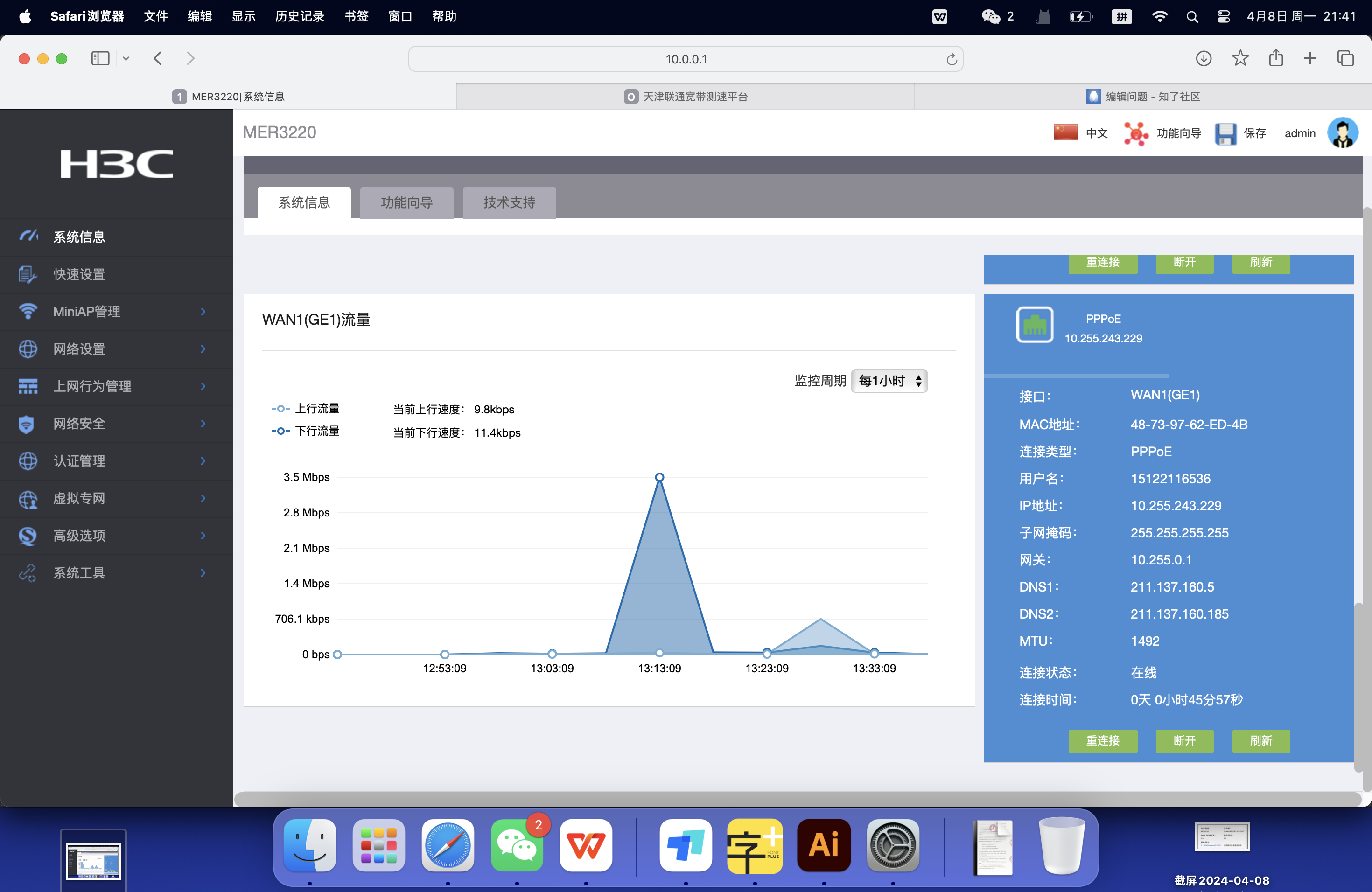 用运营商的光猫拨号或电脑拨号,电脑直连运营商可以跑满,用MER3220最快只能到 250Mbps。