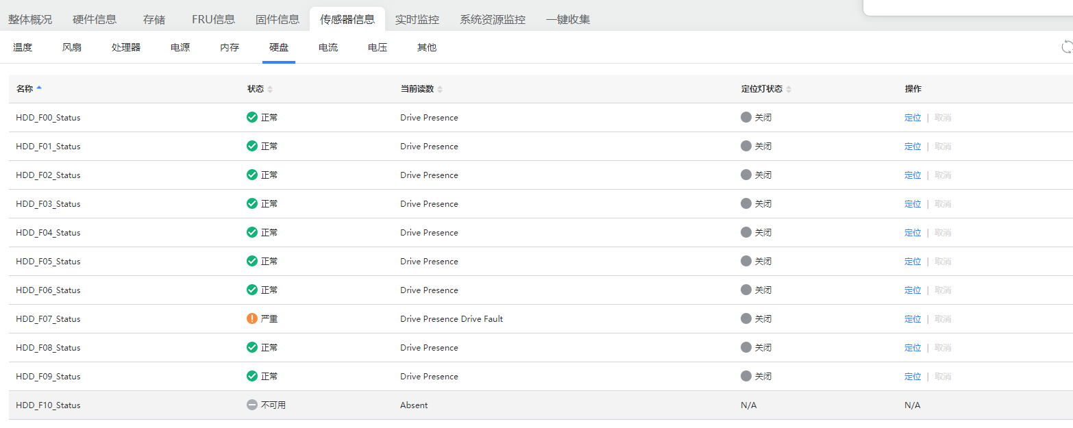 某局点在进行UniStor X10000 G3存储服务器上架时任意插拔硬盘后导致部分槽位硬盘无法识别,在HDM上显示硬盘故障的告警,出现Drive fault的告警或者Drive Presence Drive Fault的告警。在HDM解决存储管理界面对应槽位的硬盘也无法识别,告警截图如下: