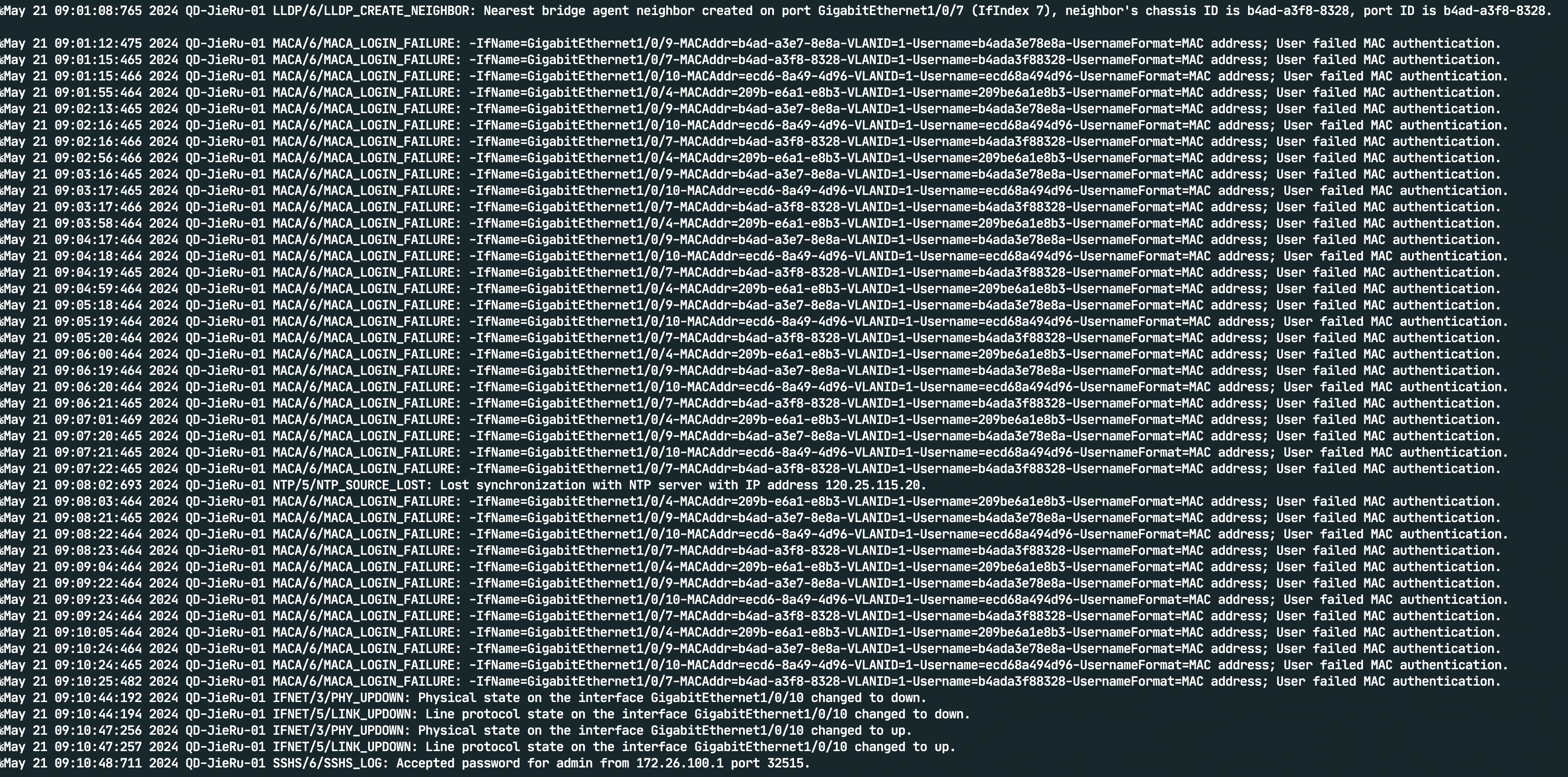出现故障后登录查看日志,基本都是mac地址认证失败的信息..设备是 H3C S5120V2-52P-LI .具体日志如下.