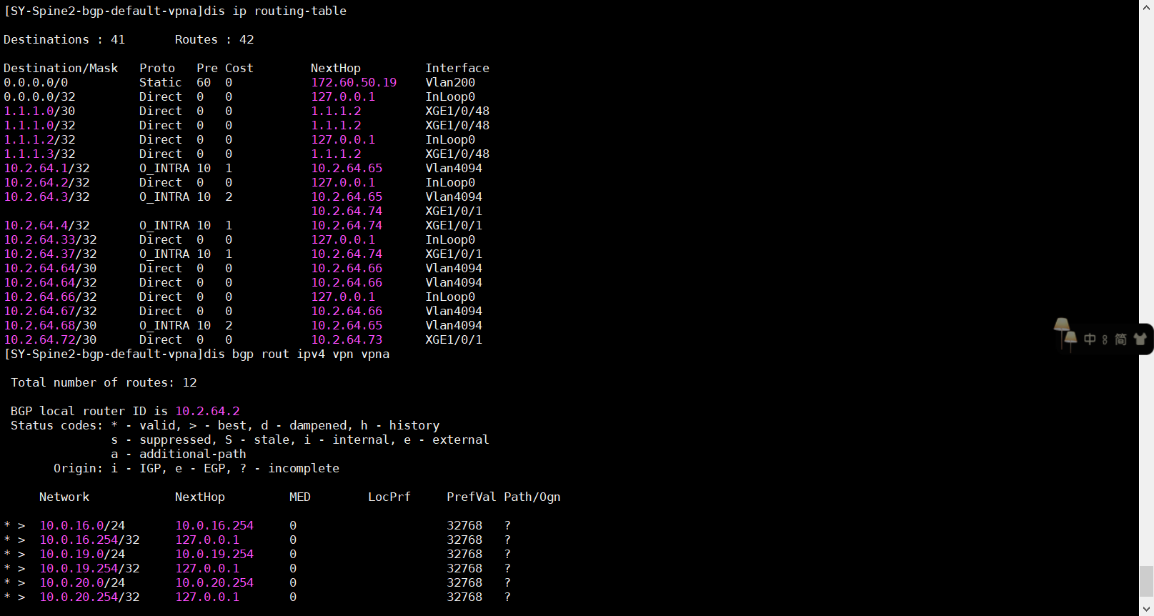 BGP邻居已建立,引入的缺省路由生效,可访问外部地址,以下为BGP引入配置和两张表项