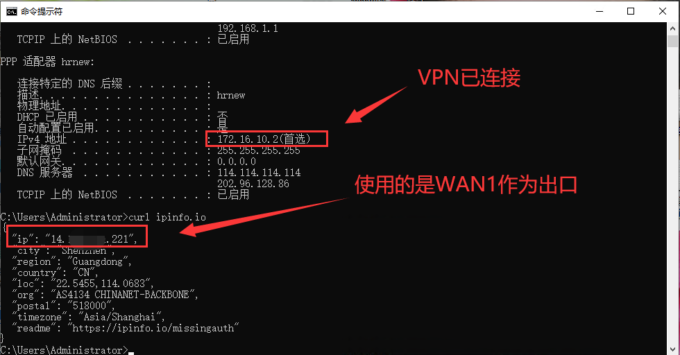 VPN客户端拨号情况及出口情况如下: