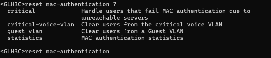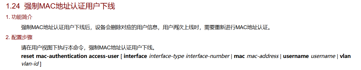 想在telnet强制关闭MAC地址认证用户下线,使用官方手册内并没有找到命令,官方手册命令如下::在交换机上输入命令为:reset mac-authentication ?,输出为:
