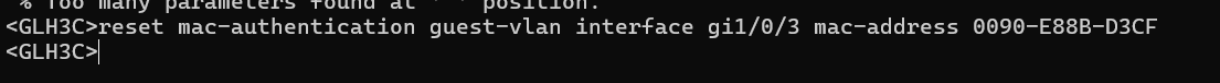 自己找到的命令为:reset mac-authentication guest-vlan interface gi1/0/3 mac-address 0090-E88B-D3CF,但是输入完之后,执行dis mac-au发现并未将MAC强制下线,截图如图: