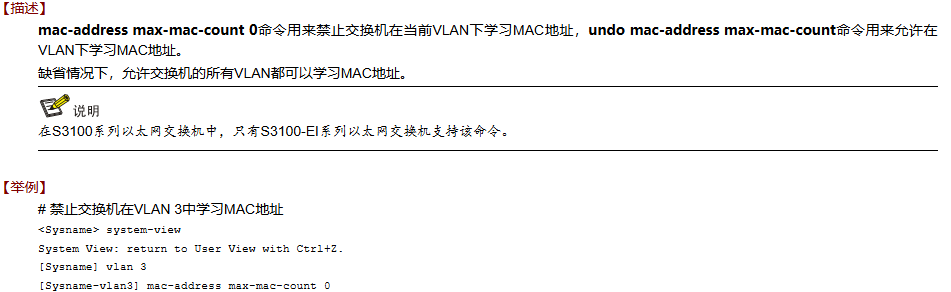 mac-address max-mac-count 0命令用来禁止交换机在当前VLAN下学习MAC地址,undo mac-address max-mac-count命令用来允许在VLAN下学习MAC地址。