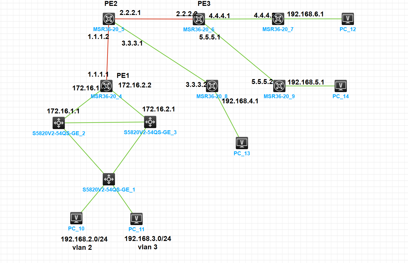 模拟器做MPLS+OSPF,现在无法全互通,PE学不到其它PE过来的CE路由信息,求大神指点迷津
