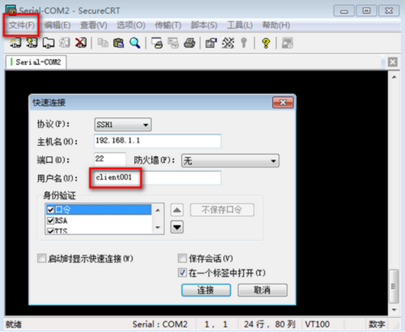打开文件---快速连接,选择协议SSH1,输入设置的用户名和口令: